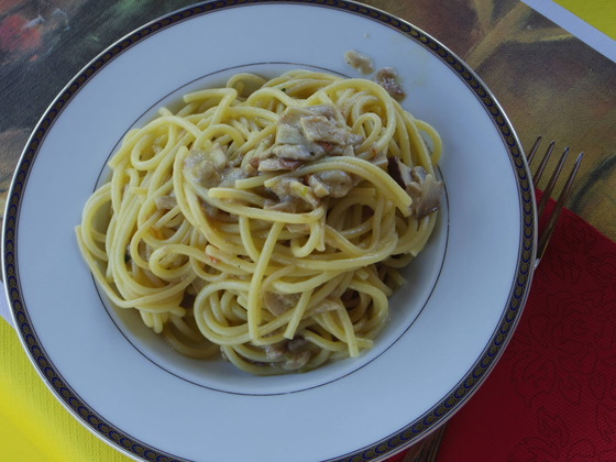 さみしいですか?そんなことないです。ばらはあるし、Pastahaあるし、春にポルチーニが出ます。今年は雨が長かったので、たくさんポルチーニが出ています。そこで、今日は、Spaghettoneとテフロンのレモンの入ったパスタを混ぜて、料理しました。