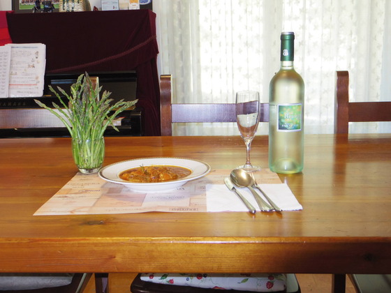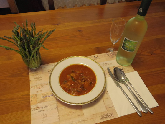 今日は、さっぱりBrio フリザンテの白で合わせました。花は、凝りに凝っているアスパラSelvaticoです。ままごとでした。