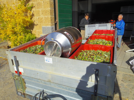 社に二人のオリーブオイルソムリエがいます。その二人がけっこう、手伝いにも来ないのに、うるさいのです。で、今年からMulino(油引き工場)を変えました。Mulinoの機械が古くて、でも人が良いところを20年も使っていたのですが、人が悪くてそれでも機械が新しく、技術の高いところが、しかも近くにあって、人の悪いのは私が少し苦労すればいいと思って、新しいところに変えました。もちろん、CecciとかFrantoioという(オリーブの種類です。)辛めのものは、すでに収穫して、いつものTreviに送って、600本ほど日本におくりましたが、オリーブというのは、今時分にならないと油分がでないので、本格的に収穫するのは今です。また味は集めてから挽くまでが勝負なので、これ本当に、体力使うのです。2kgは落ちますよ。
