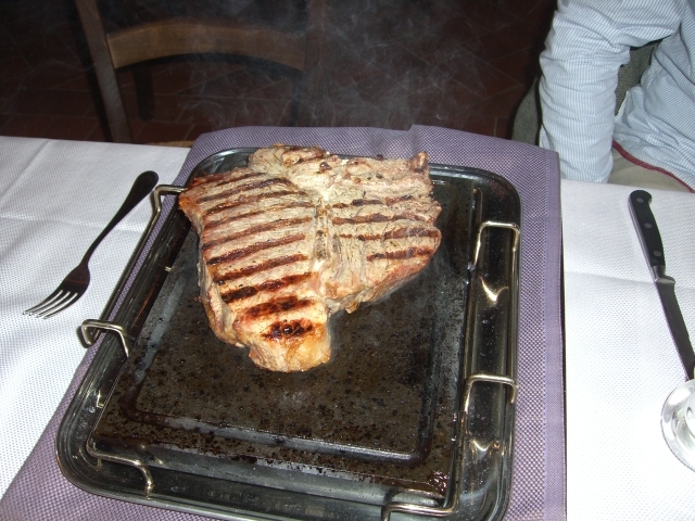 ここまで来ると、メインの料理は、フィオレンテイーナでしょう。白くてツノが、ローマ法王の手のように広がっているキニーネ牛のTボーンステーキですが、1,2kg以上のものです。やはり一人では、健啖家を誇る私でも無理でした。