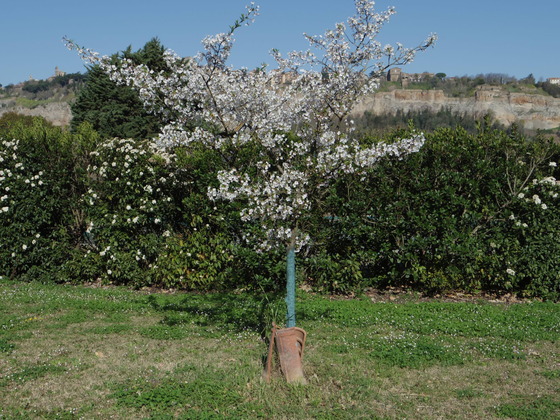 これは、近藤友司さんにねだってOrvietoにもってきて駅の真上の公園に植えて枯れたときの予備にここに飢えた吉野の桜です。しかし草刈り機で私が根本を切ってばい菌が入って弱ったものを、何とかここまでもたせたものです。Il Riposinoには、5本の桜の木がありますが、今年は、サクランボの桜のほうが早く咲きました。