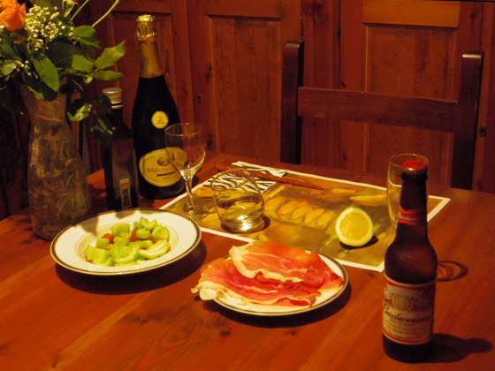 セロリの新鮮なものとランブラス通りの中ほどにある市場で買ってきたカラスミに取りたてのオリーブオイル塩のものとCavaで夕食を始めます。生ハムで元気つけて、明日は陽が出そうなので、シートを乾かしたり、プールの水とったり、チューリップ植えたりエントツも掃除しないといけないたいへんな一日になりそうです。