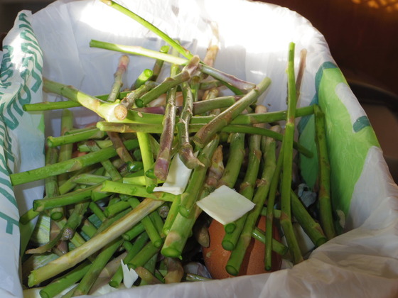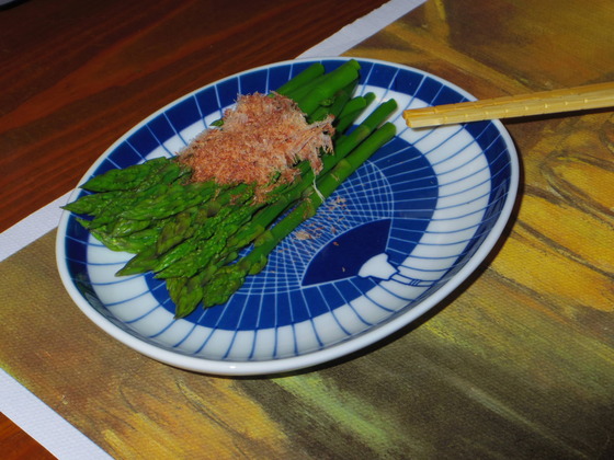 大量にあるので、切ってみました。 何しろ、野生のものなので、かなり茎をきらないといけないのです。ですから、切ったあとは、このようです。 そして、今日は贅沢におしたしにしてみました。 おかかは築地伊勢啓のもの、皿は伊万里で江戸時代の職人がデザインした傘のもの。これに米油と醤油で食べました。 文句あります?はし置きがないか? 美味しいのです。今ここでしかできない贅沢です。 アスパラSelvatico でした。