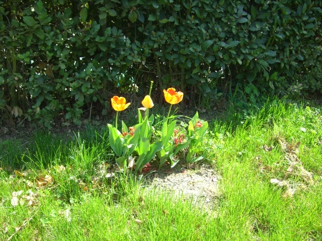 昨年春、チューリップを職人に切られてしまったので、春になると毎年顔を出してくれるチューリップが懐かしく、昨年の秋に、植えたら、「始めまして!」というささやきとともに、顔を出してくれた、チューリップです。