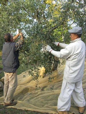 今年は少し早めに寒さがきているようです。通常では、もう少しおそいのですが、今年は、収穫をはじめました。オリーブの収穫は見ていると面白そうなのですが、けっこうたいへんな作業です。まず、雨が多い時期なので、晴れ間を待って収穫をします。また地面が濡れているとだめなので、たいてい午後からの収穫です。しかもそろそろ、夜明けが遅く、日が沈むのも早くなってきたので、時間との戦いでもあります。その上ここでは手摘みをしているので、時間がかかります。下がぬかるんできているので、そして粘土層なので、足元が泥んこで動きづらいし、高いところは、木の階段を使うのです。そこからよく落ちて死んじゃった!という事件も起こるほど危険な作業でもあるのです。
