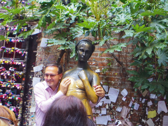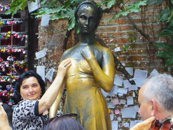 ロメオが登ったというジュリエッタの窓辺は、今の私でもその気になれば、登れる程度の窓辺でした。しかし、その後みた光景は?、そのジュリエッタの家の中庭に、ジュリエッタの像があるのです。その左のおっぱいを触ると福が来るとかで、多くの善男善女?が像のおっぱいを触るのです。オジサンが触るのは、見ていられないのですが、みなにこやかに触るのです。