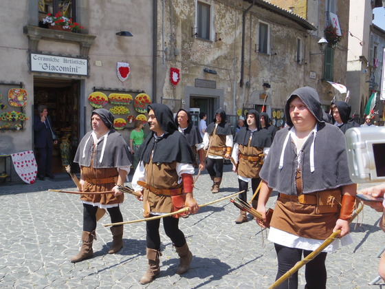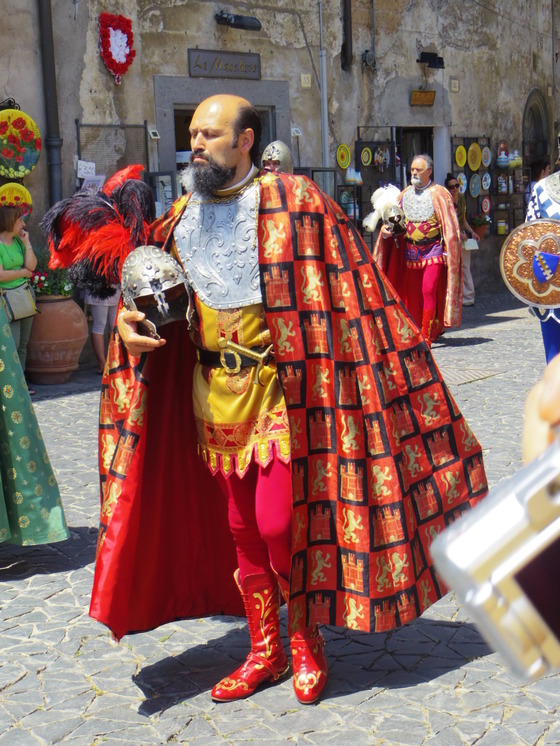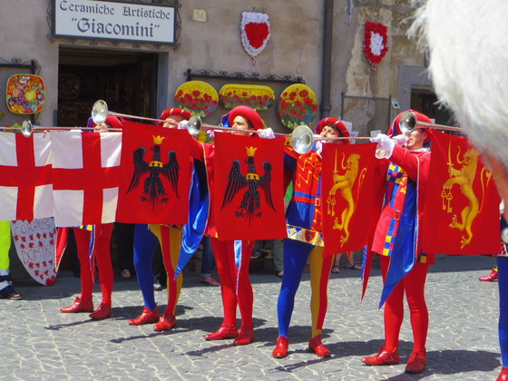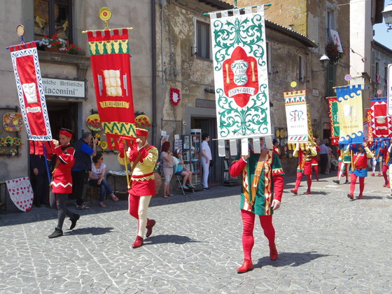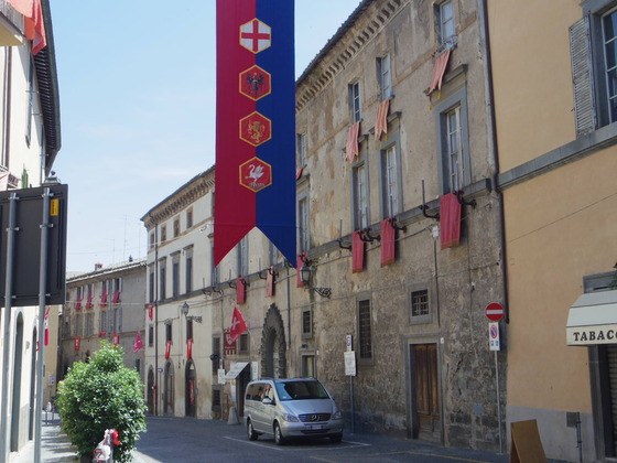 そしてこの日は、街並みも飾り付けします。各部落の旗をベランダから下げるのです。一年で一番Orvietoが輝くときです。