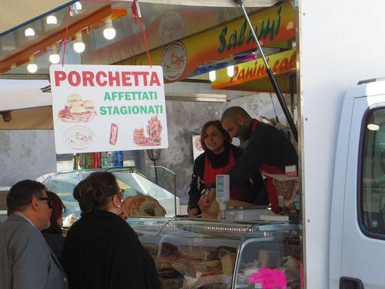気を取り直して、今日は、木曜日、Mercato(日本的には青空市場)なので、デル・ポポロに行ったら、土曜日なのでPorchetta(豚の丸焼き)をやっていました。