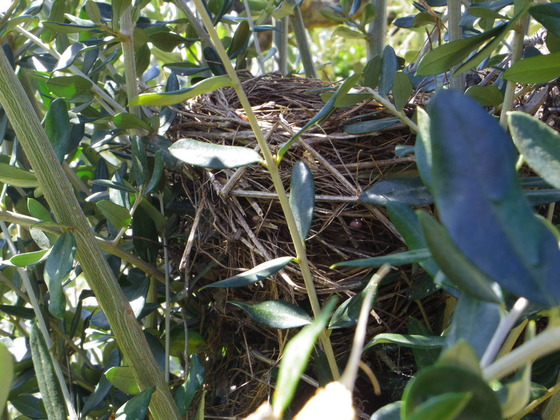 こういう巣の周りは本来、もう少し切らないといけないところがあるのですが、外敵に見つかるとかわいそうなので、ほっておきます。今年は、鳥の巣が3つ、穴の空けられたオリーブが二つありました。