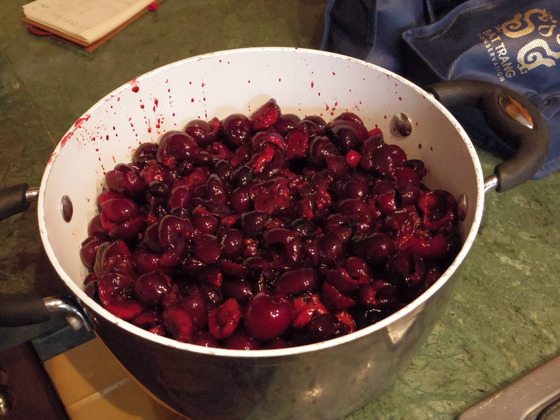 寒く、地面も濡れているので、今日は、取り残ったサクランボでジャムを作りました。